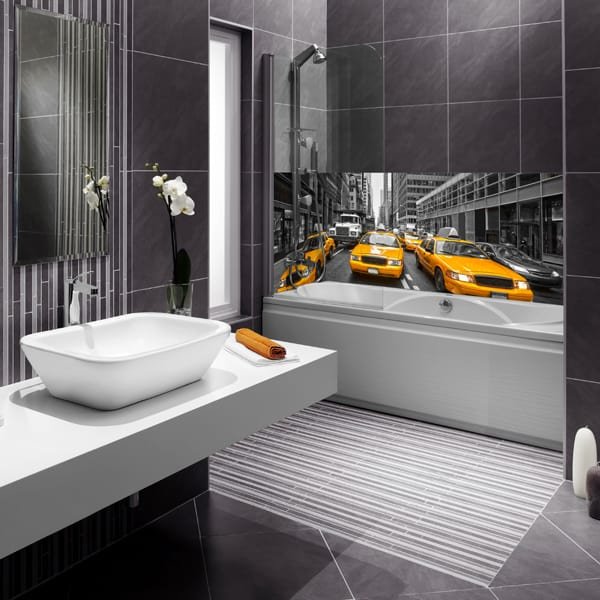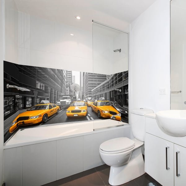 La crédence baignoire taxis new-yorkais apporte une touche urbaine et graphique autour de la baignoire grâce à une composition visuelle inspirée des rues new-yorkaises. Les taxis jaunes, emblématiques, structurent le décor et créent un contraste fort qui dynamise l’espace bain.