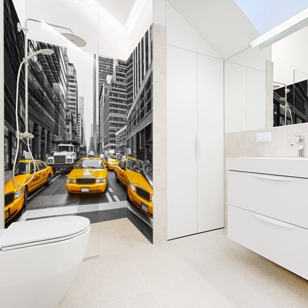 Le panneau mural douche taxis new-yorkais transforme la douche en un espace urbain graphique et dynamique. La répétition des taxis jaunes, les lignes de circulation et les contrastes visuels créent un décor rythmé qui donne du relief aux murs.