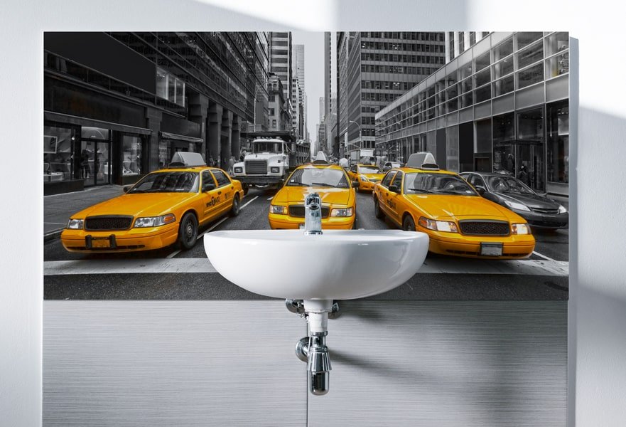 Mis en valeur par le noir et blanc de la photographie, le célèbre jaune des taxis amène une touche de couleur et de modernité.