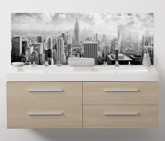 Ce panneau mural donne une identité visuelle puissante à la salle de bains tout en conservant une grande lisibilité décorative. Inspiré de l’architecture métropolitaine, il évoque l’énergie des grandes villes et rappelle, par ses lignes verticales, l’esthétique des quartiers emblématiques de Manhattan, sans jamais s’imposer.